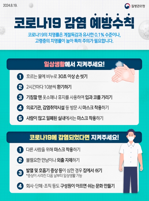 아울러, “추석 연휴를 건강하게 보내기 위해서는 우리 모두가 일상에서 손씻기, 주기적인 실내 환기, 기침 예절 준수 등 코로나19 감염 예방수칙을 실천하는 것이 무엇보다 중요하다.”고 전하고, “질병관리청은 코로나19 발생 상황을 지속해서 살피고, 필요한 정보를 적시에 공유할 것이며, 추석 연휴 기간에도 필요한 대응을 이어갈 것”이라고 밝혔다.