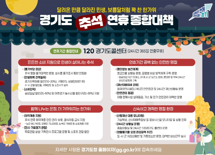 연휴 기간 불편 신고와 문의는 경기도 콜센터(☎120)를 통해 24시간 상담할 수 있으며, 진료가 필요할 경우 응급진료 상황실에서 문 여는 병·의원과 약국을 안내받을 수 있다.