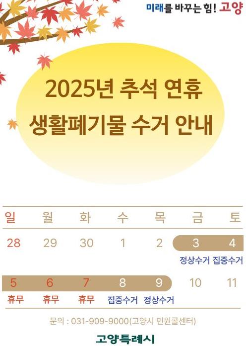 특히, 10월 8일 대체공휴일에도 생활쓰레기 수거를 정상적으로 실시해 시민 불편을 최소화할 방침이다.