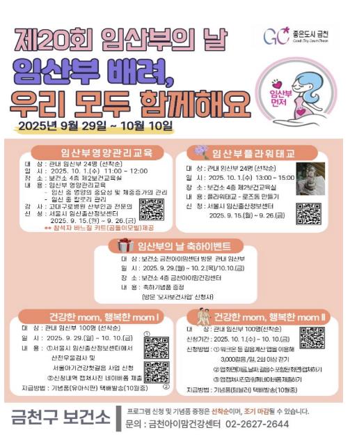 행사는 금천구에 등록된 임산부를 대상으로 진행된다. ▲ 임신기간 영양관리교육 ▲ 플라워태교 체험 ▲ 보건소 내소자 축하 이벤트 ▲ 건강 프로그램 등 다양한 내용으로 구성된다.