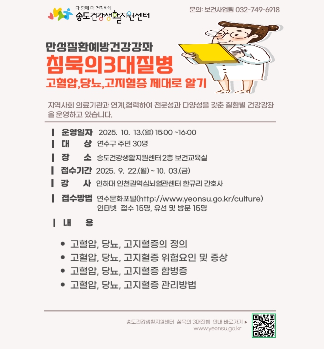 ![]() 연수구, 무료 건강강좌 ‘침묵의 3대 질병’ 참여자 모집 |