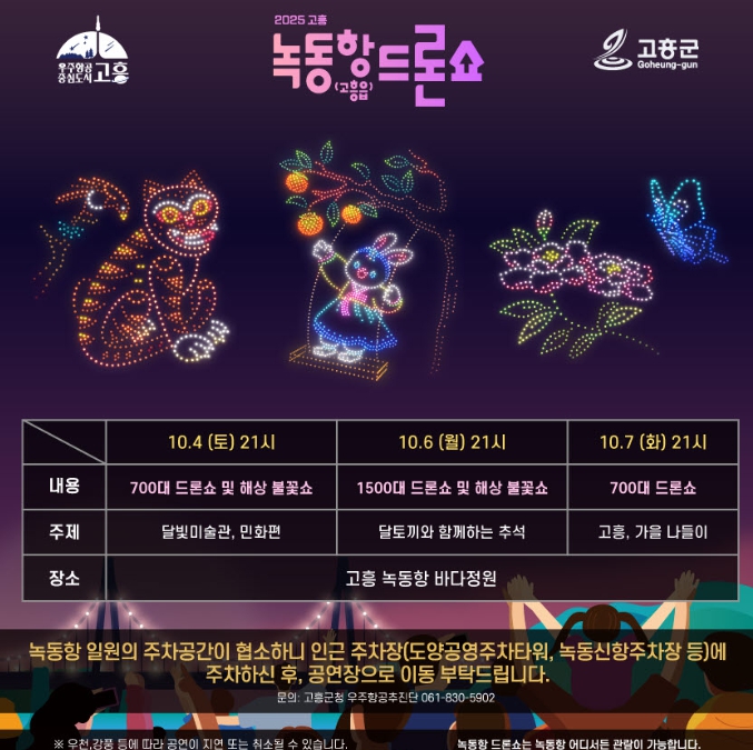 고흥군 녹동항 드론쇼는 오는 10월 25일 폐막식을 앞두고 있으며 강우, 강풍 등 기상 여건에 따라 일정이 변경될 수 있다.