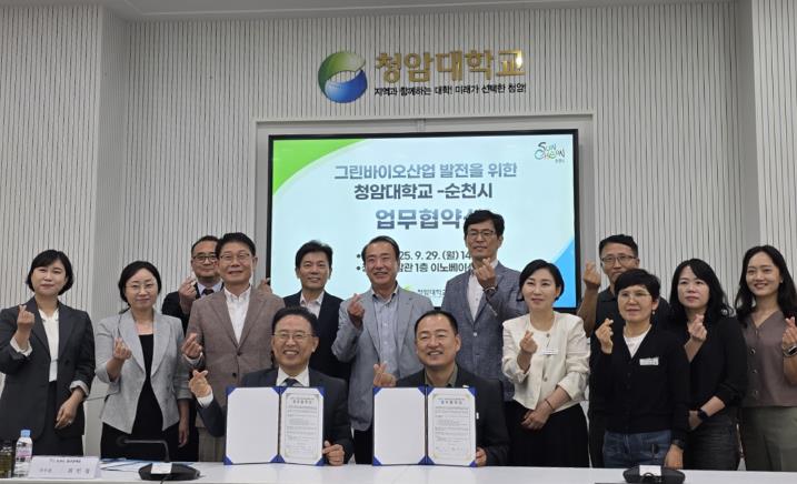 협약식에는 김성홍 총장직무대행, 김재빈 순천시 미래산업국장 등이 참석해 순천시 그린바이오 산업 발전과 육성을 위한 양 기관의 협력 의지를 다졌다.