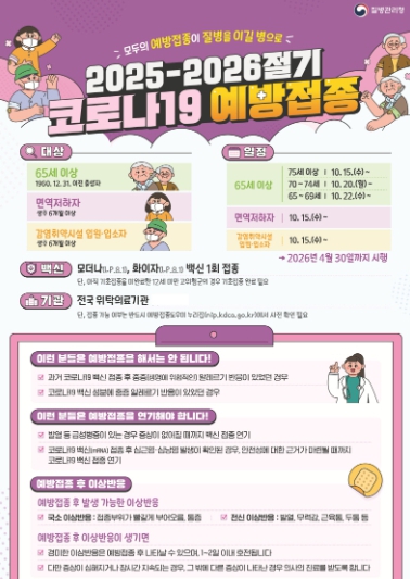 이번 접종은 연령별·대상별 순차적으로 진행된다. 면역저하자와 감염취약시설 입원·입소자는 10월 15일부터 접종을 시작하며, △75세 이상은 10월 15일 △70~74세는 10월 20일 △65~69세는 10월 22일부터 각각 순차적으로 접종이 가능하다.