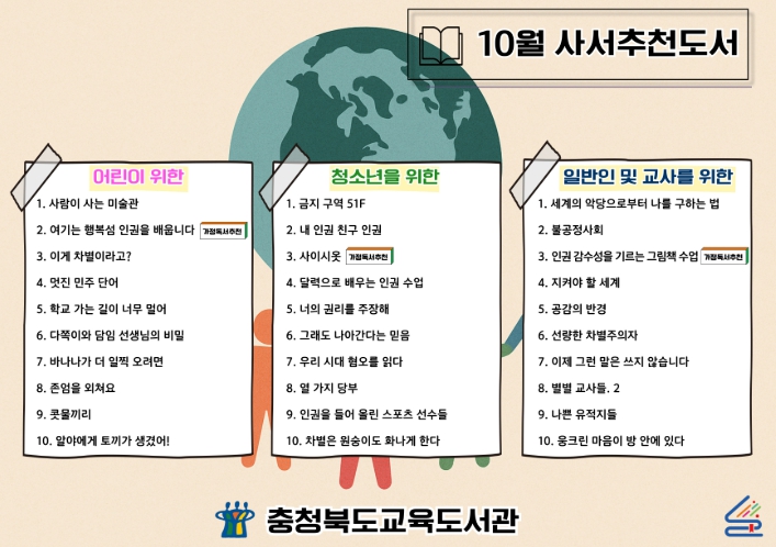 쉽고 따뜻한 이야기 속에서 인권의 개념을 자연스럽게 이해하고, 공감과 존중의 마음을 기를 수 있도록 어린이들을 위해 ▲사람이 사는 미술관(박민경 글, 서예원 그림, 그래도봄) ▲여기는 행복섬 인권을 배웁니다(한화주 글, 김이조 그림, 천개의바람) ▲이게 차별이라고?(고수산나 글, 이경택 그림, 스푼북(열다)) 등 10권을 선정했다.
