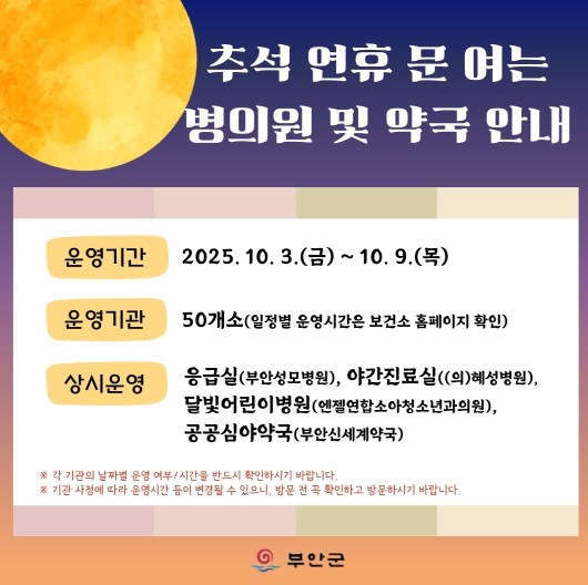 추석연휴 기간 중 운영하는 의료기관 및 약국 정보는 부안군청 및 보건소 홈페이지에서 확인할 수 있으며, 응급의료포털, 보건복지상담센터, 119구급상황관리센터를 통해서도 안내받을 수 있다.