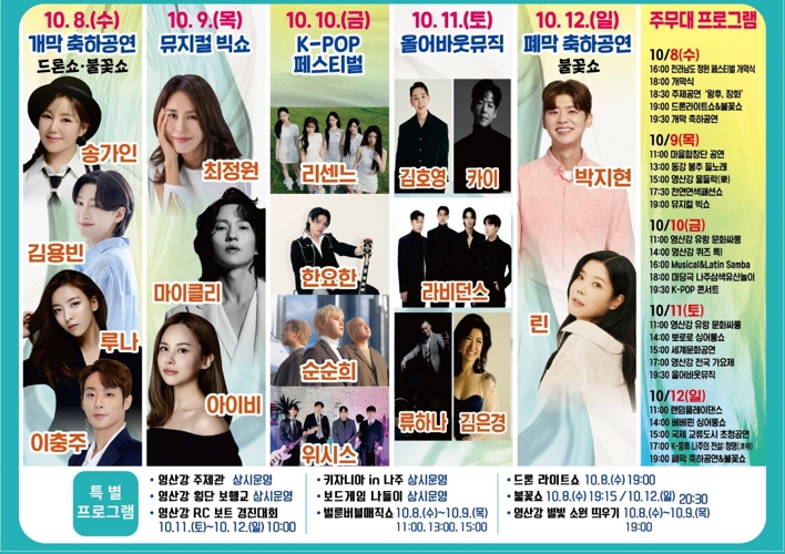 10일에는 젊은 세대를 겨냥한 K-POP 페스티벌이 열린다. 실력파 5인조 걸그룹 리센느, 폭발적 무대를 자랑하는 락커 겸 래퍼 한요한, 독특한 색깔의 남성 발라드그룹 순순희, 위시스가 무대를 꾸민다. K-POP 팬들에게는 젊음과 열정이 가득한 최고의 축제가 될 전망이다.