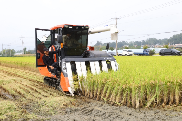 ![]() 충주시 지역대표 쌀 신품종 중원진미 첫 수확(조길형 시장 트랙터 운전하며 벼 베기) |