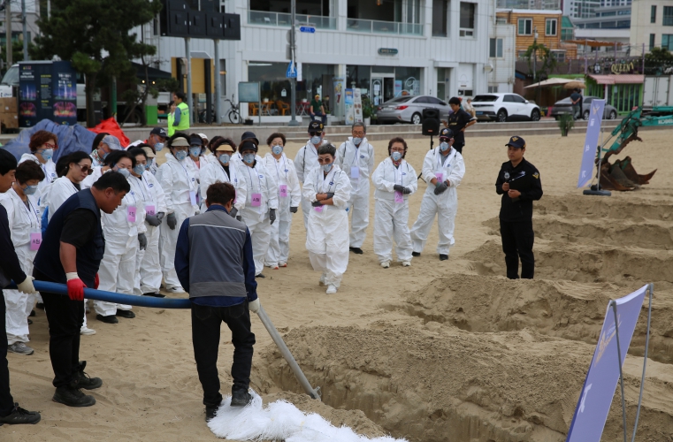 모래, 인공구조물, 자갈 3개 섹터로 구분하여 비치크리너(진공 흡입식 기름제거 장비), 고압·저압세척기 등 해안특성별 적합한 장비·자재를 훈련 참여자들이 직접 체험하는 교육형 현장훈련으로 진행됐다.