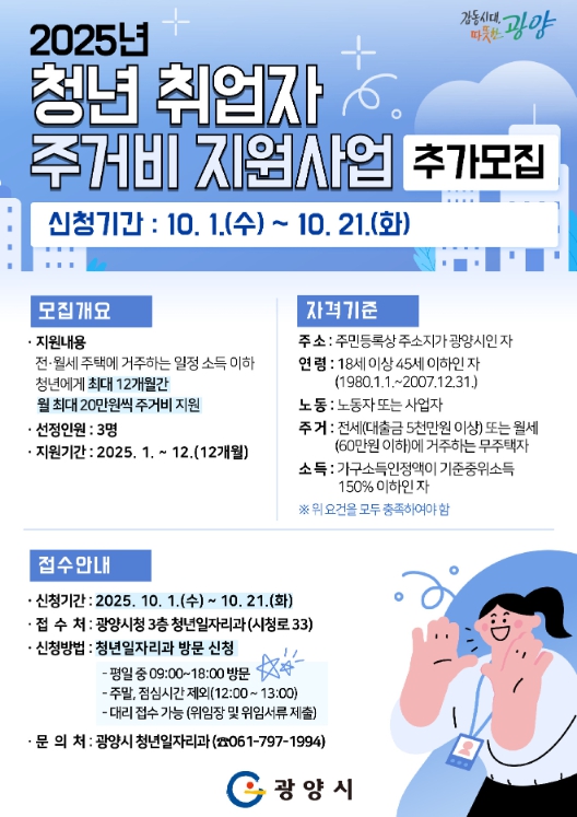 지원 자격은 광양시에 주소를 둔 18세 이상 45세 이하 청년 노동자 및 사업자로, ▲가구소득인정액이 기준중위소득 150% 이하이고 ▲전세 대출금 5천만 원 이상 또는 월세 60만 원 이하인 주택에 거주하는 무주택자여야 한다.