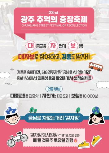 ‘금남로 차 없는 거리’는 올해 3월부터 자동차 중심이 아닌 사람 중심의 도시공간 조성을 위한 시범 사업으로 매월 첫째 주 토요일에 개최되고 있다.