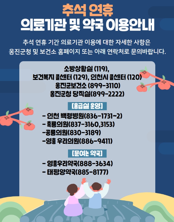 연휴 중 문을 여는 병·의원과 약국 정보는 국번 없이 ▲129(보건복지콜센터), ▲119(구급상황관리센터), ▲응급의료포털, ▲스마트폰 애플리케이션 ‘응급의료정보제공’ 및 ‘응급똑똑’, ▲옹진군청(옹진군보건소) 홈페이지에서 확인할 수 있다.