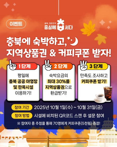 장인수 충북도 관광과장은 “평일 숙박 환급 지원과 만족도 조사를 연계해 관광객들의 참여를 높이고, 의견을 나눌 수 있는 기회를 마련했다.”며, “많은 분들이 충북에서 머무르면서 혜택도 누리고 선물도 받을 수 있는 이번 조사에 많은 분들의 관심과 참여를 부탁드린다”고 말했다.