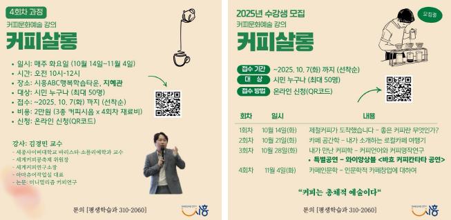 이번 ‘커피살롱’ 특강은 시흥 북부권 대표 축제인 세계 커피콩 축제를 사전에 알리고, 은계지구를 비롯한 지역 활성화와 시민 참여형 학습 문화를 확산시키고자 마련됐다.
