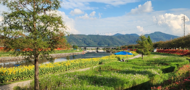 투명한 그 냇물에 쪽빛 하늘과 뭉게구름, 노란 해바라기, 붉은 꽃무릇을 그대로 담아내 만화경을 들여다보는 듯한 새로운 풍경을 만들어낸다.