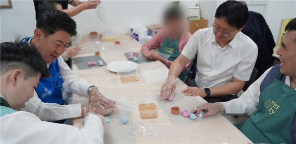 ![]() 박지훈 신한은행 인천금융센터 지점장과 최진산 부지점장이 지난 1일 미추홀푸르내에서 거주 장애인들과 송편을 빚고 있다. |