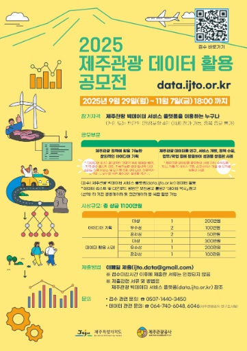 이와 관련, 제주관광공사 관계자는 “이번 공모전을 통해 제주관광 빅데이터 서비스 플랫폼이 널리 알려지고, 데이터 활용이 더욱 확대되는 계기가 되길 바란다”며 “참가자들의 참신한 아이디어와 실제 활용 경험이 모여 새로운 관광 서비스와 가치를 만들어 낼 수 있을 것으로 기대되는 만큼 많은 관심과 참여를 부탁드린다”고 전했다.
