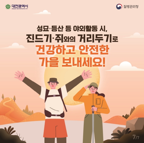 태준업 대전시 체육건강국장은 “가을철에는 긴소매와 긴 바지, 밝은색 옷 착용, 풀밭에 앉지 않기 등 예방수칙을 생활화해야 한다”라며 “발열·근육통 등 의심 증상이 나타나면 즉시 의료기관을 방문해 진료를 받아야 한다”라고 당부했다.