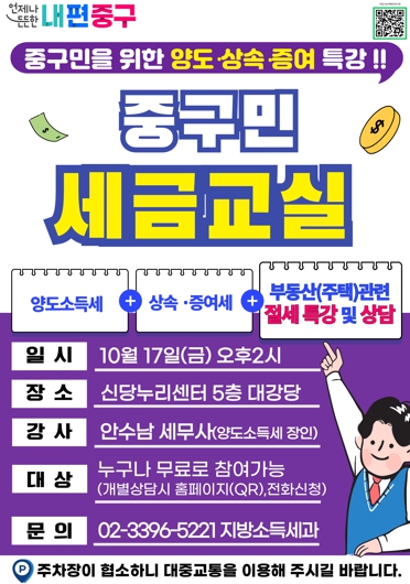 강의 후에는 중구 야간 세무상담을 담당하는 전문 세무사들이 일대일 맞춤형 상담을 통해 개인별 절세 전략을 알려준다. 상담은 선착순 사전신청자 30명을 대상으로 한다.