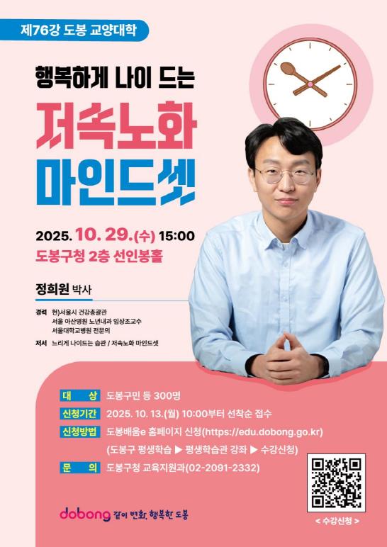 ![]() 도봉구, 정희원 박사 초청 ‘저속노화 마인드셋’ 특강 홍보 포스터 |