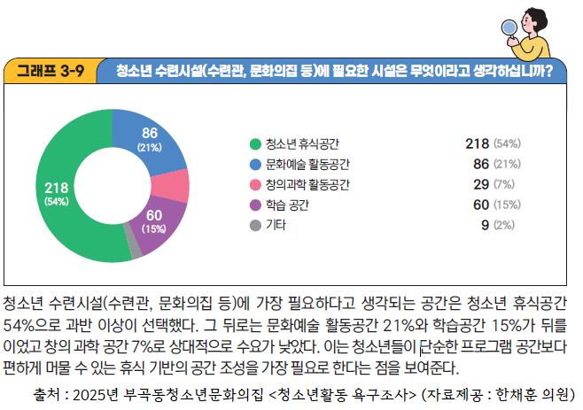 부곡동청소년문화의집 응답 청소년의 절반 이상인 54%는 청소년 전용 휴식공간이 필요하다고 답했고, 포일 청소년문화의집 조사 역시 가장 필요한 공간으로 휴식공간을 1순위(36%)로 꼽았다.