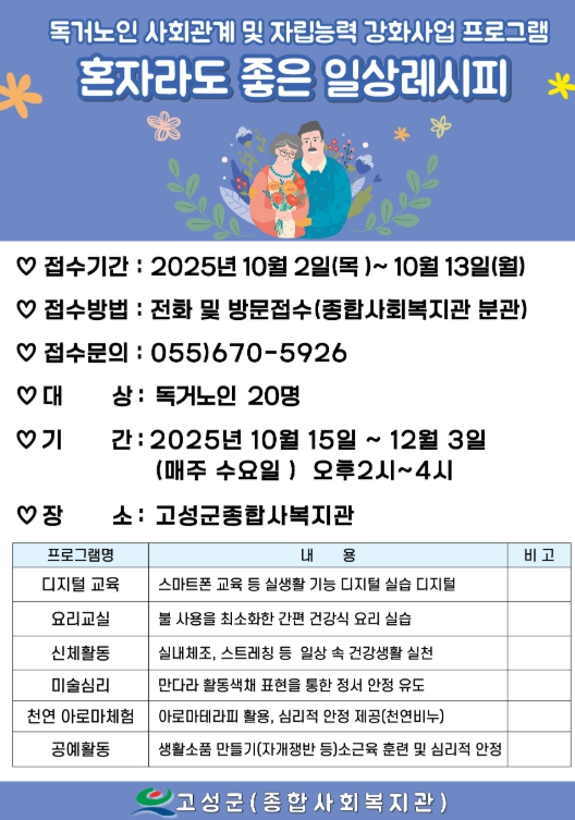 신청 대상은 고성군에 거주하는 홀로 지내시는 어르신 누구나 참여할 수 있다.