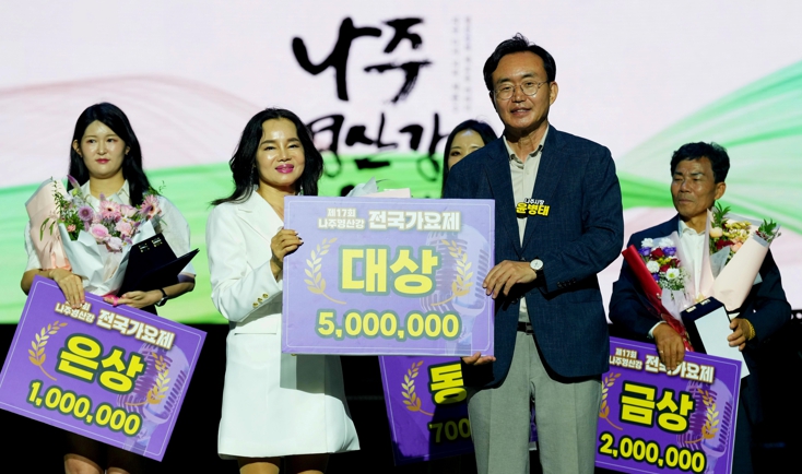 ![]() 윤병태 시장(오른쪽)이 ‘제17회 나주 영산강 전국 가요제’에서 대상을 수상한 장성희 씨에게 상금 500만 원을 전달하고 기념사진을 찍고 있다. |