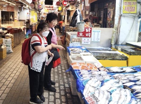 ![]() 지역 어르신이 창4동 지역사회보장협의체 위원과 생선을 사고 있다. |
