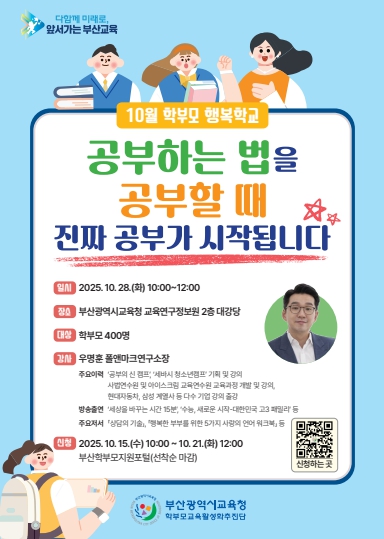 교육은 오는 28일 오전 10시부터 2시간 동안 부산진구 양정동 교육연구정보원 2층 대강당에서 진행된다. 참가 희망자는 오는 15일 오전 10시부터 학부모지원포털을 통해 선착순으로 신청하면 된다. 자세한 사항은 학부모지원포털에서 확인할 수 있다.