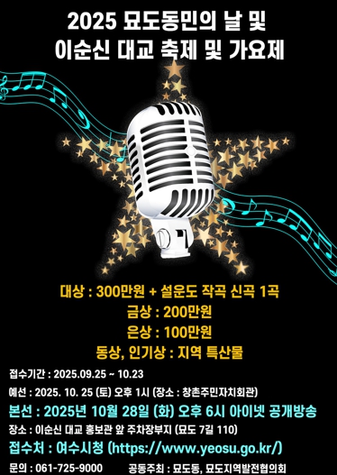![]() ‘2025 묘도동민의 날 및 이순신대교 축제 및 가요제’ 포스터 |