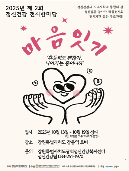 '정신건강 전시한마당'은 지난해 춘천에서 처음 개최되어 큰 호응을 얻은 바 있으며, 올해는 강릉에서 열려 더 많은 도민들이 예술 작품을 통해 정신건강의 중요성을 이해하고 공감할 수 있도록 마련됐다.