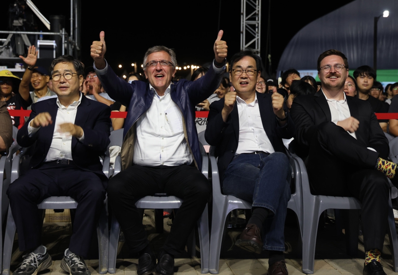 ![]() 강상구 나주시 부시장(왼쪽)과 토마스 그리스 교수(왼쪽 두 번째)가 영산강정원에서 케이팝 콘서트를 관람하고 있다. |
