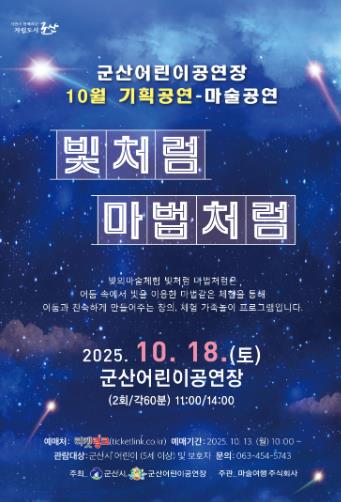 18일 오전 11시와 오후 2시 두 차례 선보이는'빛처럼 마법처럼'은 환상적인 빛의 움직임 속에서 어린이들이 직접 무대에 참여하고, 눈앞에서 펼쳐지는 빛 쇼와 마술을 통해 예술과 과학의 융합을 체험할 수 있는 프로그램이다.