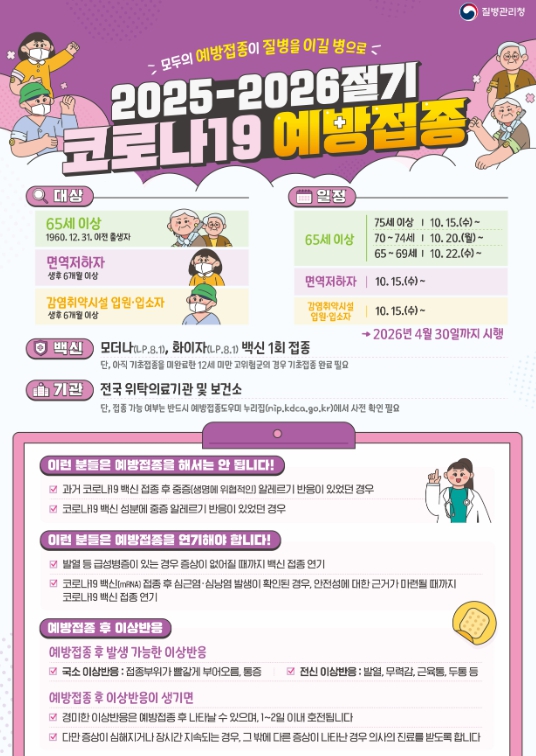 이번 접종은 65세 이상 어르신, 생후 6개월 이상 면역저하자와 감염취약시설 입원·입소자를 대상으로 실시된다.