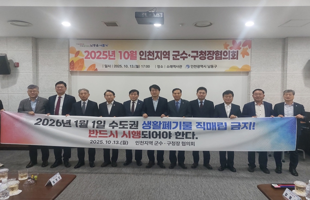 인천시는 10월 13일 남동구에서 열린 인천지역 군수・구청장 협의회에서 군・구 단체장과 함께 2026년 1월 1일부터 수도권 생활폐기물 직매립 금지는 법과 원칙에 따라 반드시 시행되어야 한다는 결의를 재차 다지며, 시민 불편 없이 생활폐기물 직매립 금지에 철저히 대비할 수 있도록 공동 대응방안을 모색했다.