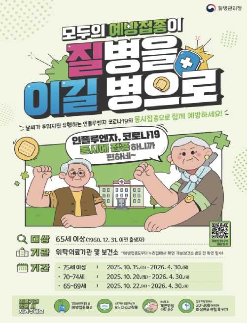 접종은 연령별로 순차 진행된다. 75세 이상은 15일부터, 70~74세는 20일부터, 65~69세는 22일부터 시작하며, 종료일은 2026년 4월 30일이다.
