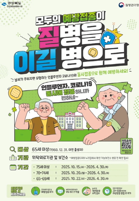 김호섭 경상북도 복지건강국장은 “코로나19 바이러스 변이가 지속하는 상황에서, 고위험군인 65세 이상 어르신과 면역저하자, 감염취약시설 입원·입소자는 신규 백신 접종으로 중증 및 사망 예방에 힘써달라”며 “특히 65세 이상 어르신께서는 코로나19와 인플루엔자 백신을 동시에 접종받아 올 겨울 건강을 안전하게 지키시길 바란다”고 당부했다.