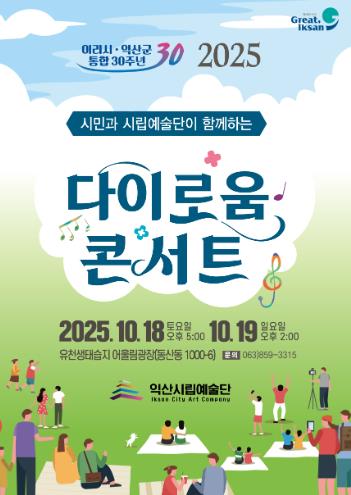 15일 익산시에 따르면 익산시립예술단은 이리시와 익산군 통합 30주년을 기념해 오는 18~19일 유천생태습지 어울림광장 일원에서 '다이로움 콘서트'를 진행한다.