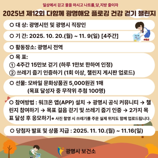 ![]() 2025년 제12회 다함께 광명해요 플로킹 건강걷기 챌린지 안내문. |