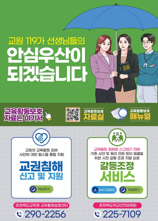 신청은 충북교육청 소통메신저 교원 119내 갈등조정 서비스 메뉴를 활용해 간편하게 지원 요청이 가능하다.