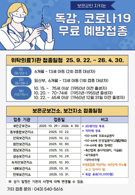 ![]() 보은군, 2025년 노인 독감·코로나19 예방접종 순차 추진 |