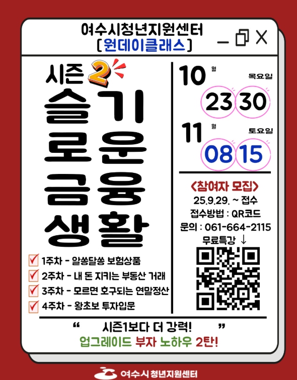 특강은 여수시청년지원센터(문수로 117) 회의실에서 열리며 대상은 여수시 거주 청년(18~45세)이다.