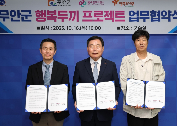 이날 협약식에는 김산 군수, 조민영 행복얼라이언스 사무국 본부장, 최준 행복도시락사회적협동조합 사무국장이 참석했다.