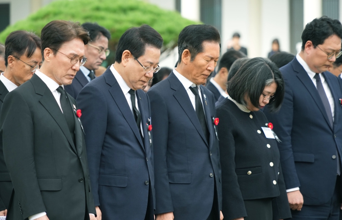 ![]() 김영록 전라남도지사가 19일 구례군 지리산역사문화관에서 열린 ‘여순사건 제77주기 합동추념식’ 행사에서 김민석 국무총리, 정청래 민주당 대표 등 국회의원들과 희생자들에 대한 묵념을 하고 있다. |