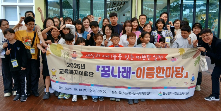 ![]() 강남교육지원청 교육복지이음단 학생들이 18일 울산마을교육공동체거점센터에서 '꿈나래-이음한마당'에 참여하고 기념촬영을 하고있다. |