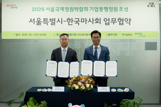 ![]() 서울특별시-한국마사회 업무협약식(왼쪽부터 한국마사회 송대영 경마본부장, 이수연 서울시 정원도시국장) |