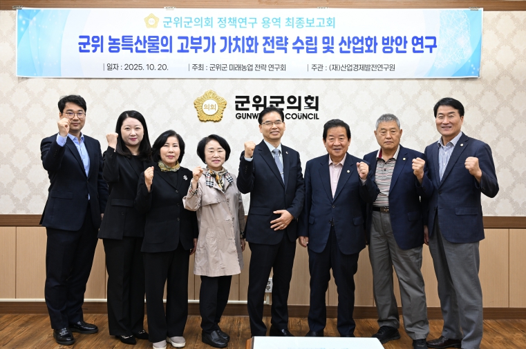 대표의원 홍복순 의원은 “군위 농특산물의 경쟁력 강화를 위해서는 행정과 농민, 지역사회가 함께 나아가야 한다”며 “이번 연구 결과를 토대로 실현 가능한 정책 과제를 도출하고 군민이 체감할 수 있는 변화로 이어질 수 있도록 최선을 다하겠다”고 말했다.