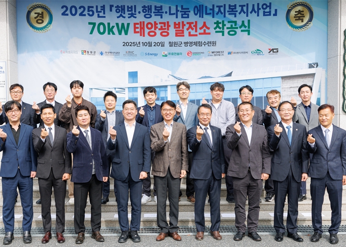 ![]() 10월 20일 강원특별자치도 철원군에 위치한 ‘철원군병영체험수련원’에서 실시된 ‘햇빛·행복·행복 나눔 70kW 태양광 발전소 착공식’에서 관계자들이 단체 기념 촬영을 하고 있다. |