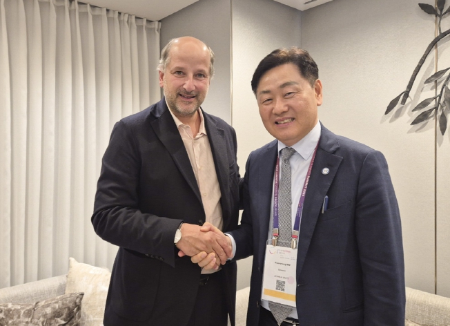 ![]() 20일 시그니엘 서울호텔에서 열린 '세계올림픽도시연맹 총회' 의 연계행사인 ‘스마트시티&스포츠 서밋’에 참석한 김관영 도지사가 그레고리 주노드 세계올림픽도시연맹회장(스위스 로잔 시장)과 면담을 갖고 있다 |