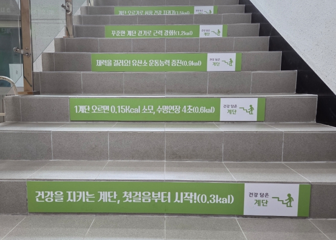 계단 디딤면에는 ‘건강을 지키는 계단, 첫걸음부터 시작’, ‘꾸준한 계단 걷기로 근력 강화’, ‘집중력 향상에 좋은 건강계단’ 등 건강 문구 띠지를 부착했으며 1층 계단 벽면에는 그래픽 디자인을 적용하고 엘리베이터 문에는 계단 이용을 유도하는 안내 스티커를 설치하여 이용자들의 자발적인 참여를 유도했다.